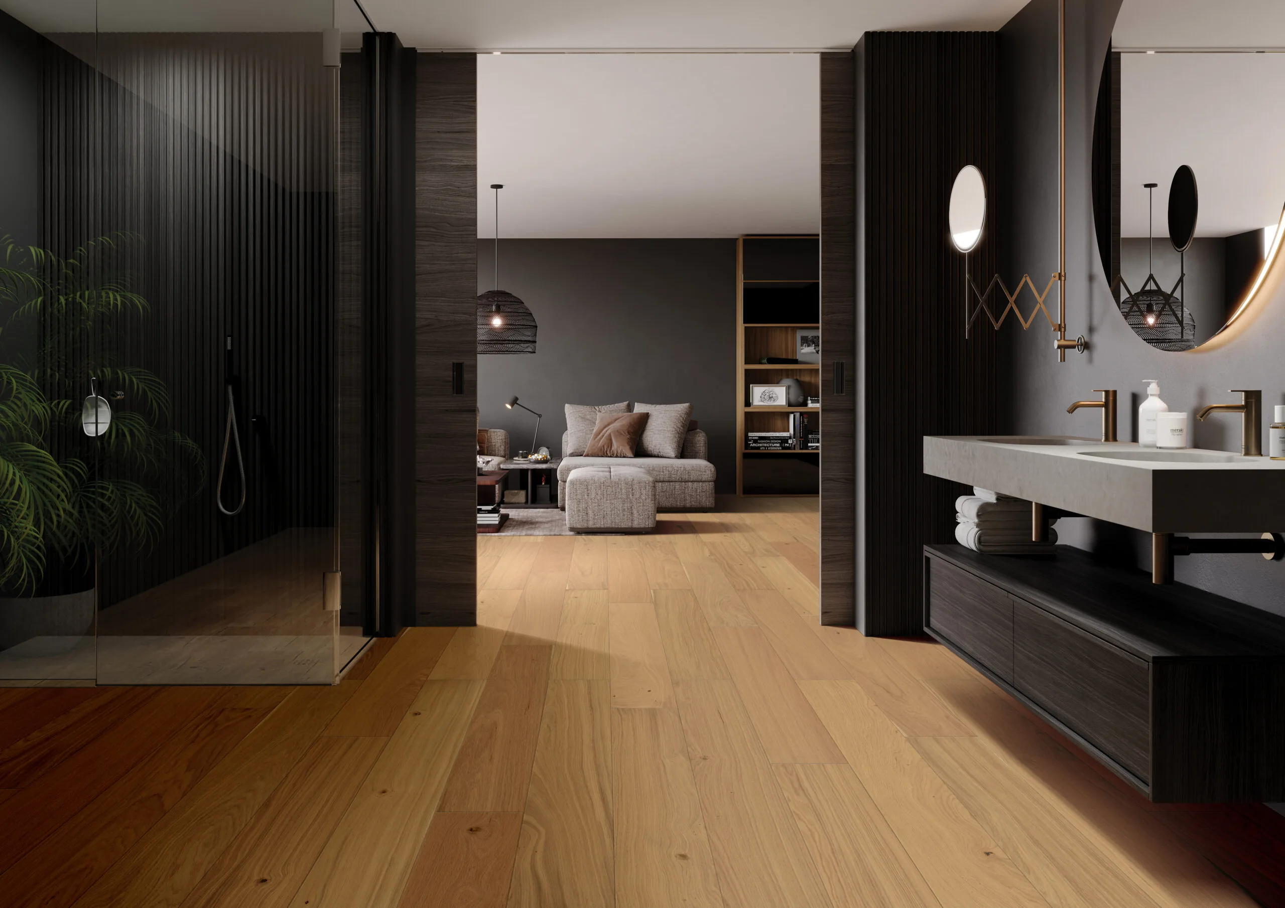 스마트 우드(Smart Wood) 하이브리드 바닥재는 천연 목재의 아름다움과 첨단 기술을 결합한 혁신적인 제품입니다. 상부의 목재 레이어는 공간에 우아함과 따뜻함을 더하고, 미네랄 코어는 습기와 손상에 대한 뛰어난 내구성을 제공합니다. 자연과 기술이 조화를 이룬 새로운 조합입니다.